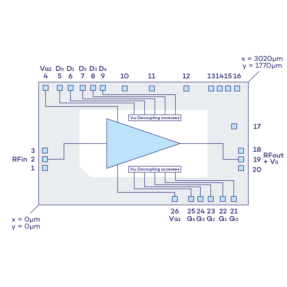 The device is capable of output voltage up to 8Vpp and has more than +23dBm of out- put power at saturation regime, up to 28GHz. It provides more than +21dBm of output power at 1dB of gain compression, up to 20GHz.The linear gain is of 16dB from DC to 28GHz, with an excellent group delay. The design has been optimized to provide high efficiency. The supply current is as low as 200mA when operating with VD= +9V.