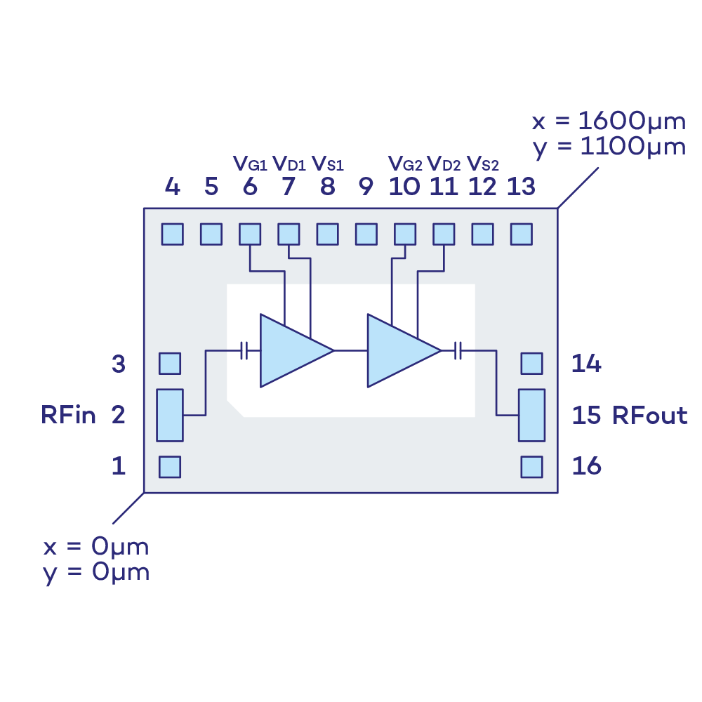 The VM017D is a low noise amplifier MMIC die operating in the frequency range 7 to 13GHz.