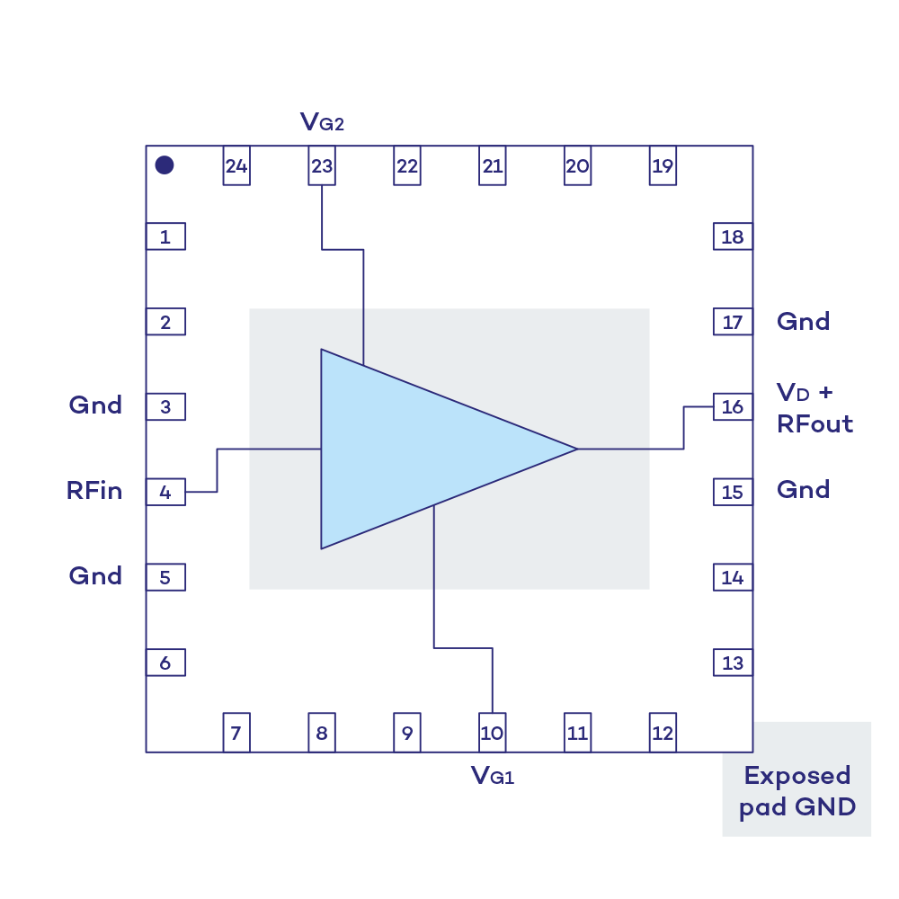 The VM056Q is a MMIC distributed amplifier in a 5x5mm 24 leads Plastic Surface Mount Package (ROHS).