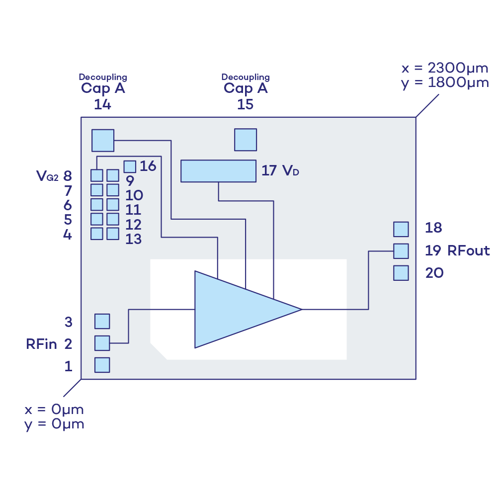 The device is capable of more than +19dBm of output power at saturation regime, up to 50GHz and more than +16dBm of output power at 1dB of gain compression, up to 30GHz. It pro- vides more than 10dB of linear gain from DC to 50 GHz with a positive slope up to 50GHz when operating with VD= +8V, with an excellent group delay. The design integrates an internal active drain biasing system that allows to avoid external Bias-Tee structure to feed the drain current. The supply current is as low as 135mA when opera- ting with VD= +8V.