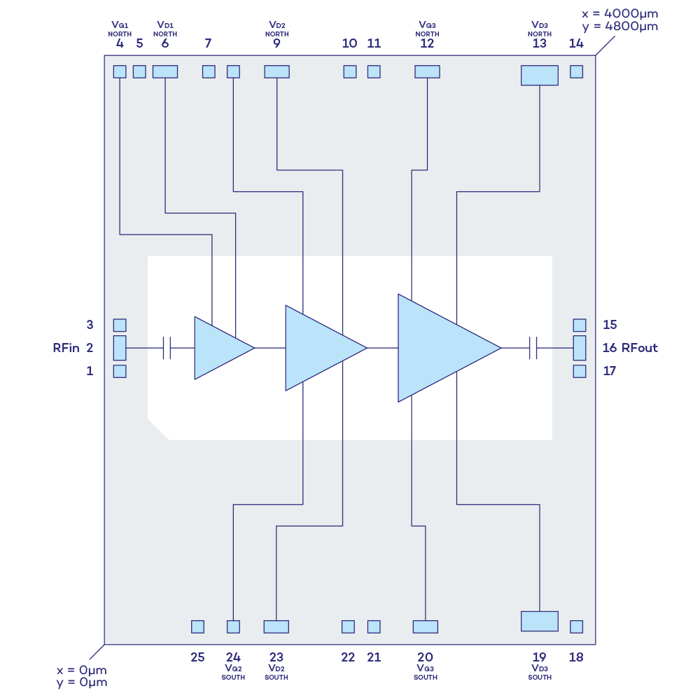 The VM087D is a Microwave Monolithic Integrated Circuit (MMIC) designed in HEMT (High Electron Mobility Transistor) structure for operating frequency range from 7.5 to 8.5GHz.