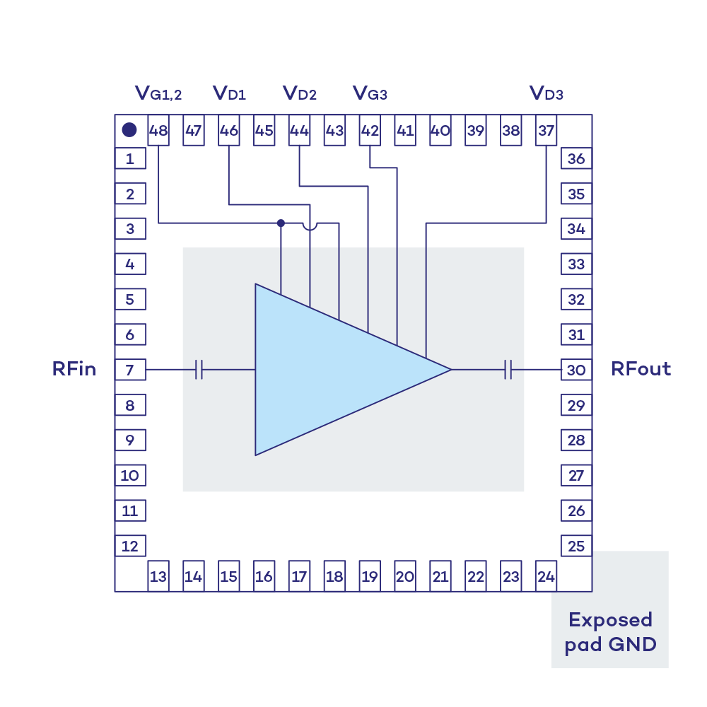 The VM090Q a plastic 48 leads 7 x 7 QFN designed to a surface mount design board. The VM090Q integrates the VM090D VectraWave HPA.