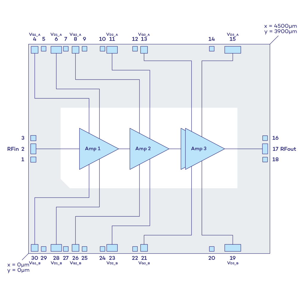 The VM102F is a High Power Amplifier MMIC operating in the frequency range from 8 GHz to 11GHz.