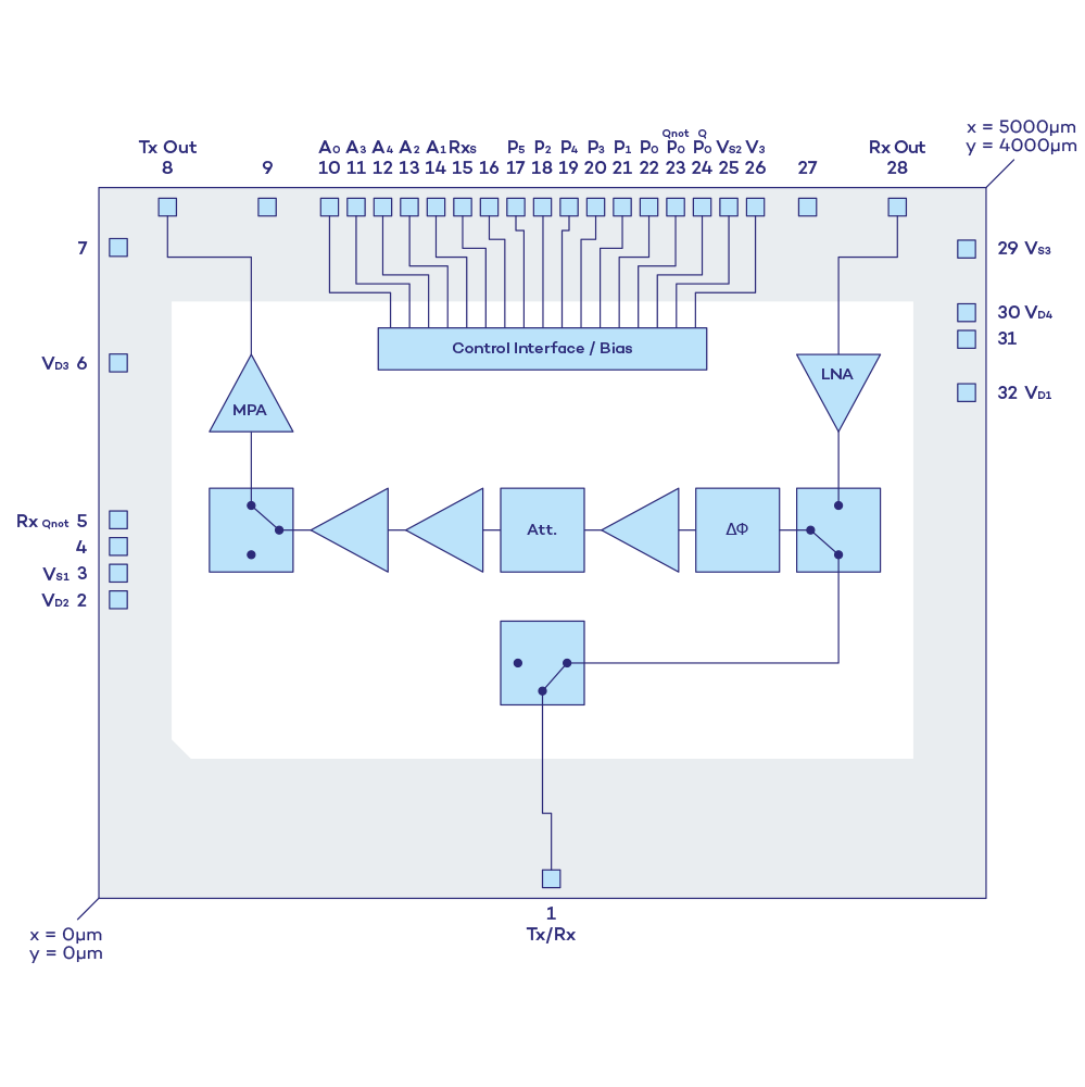 The digital control logic allows for parallel data input, so phase shifter and attenuator may be changed instantaneously.