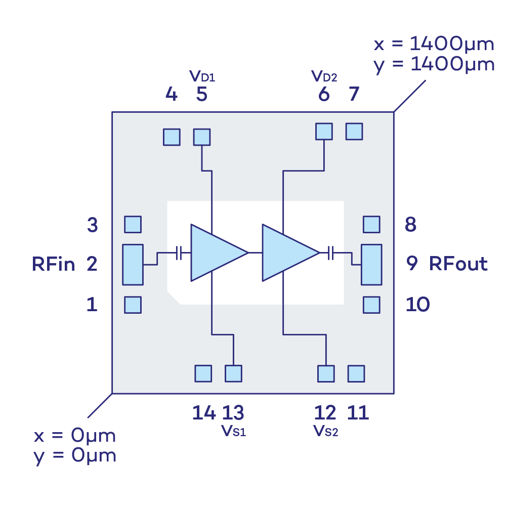 The VM135D is a low noise amplifier MMIC operating in the frequency range 8 to 12GHz.
