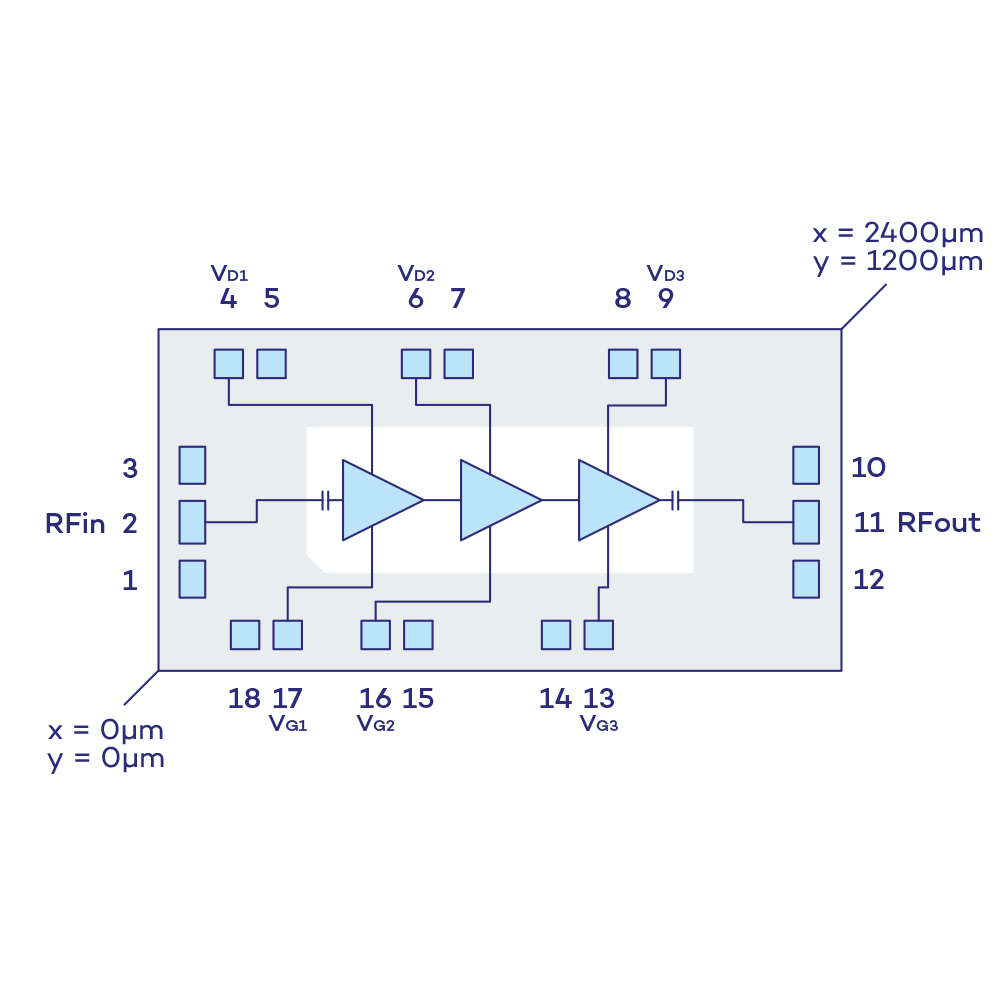 The VM205D is 3 stage Low-Noise amplifier MMIC operating in the frequency range 27 to 32 GHz.